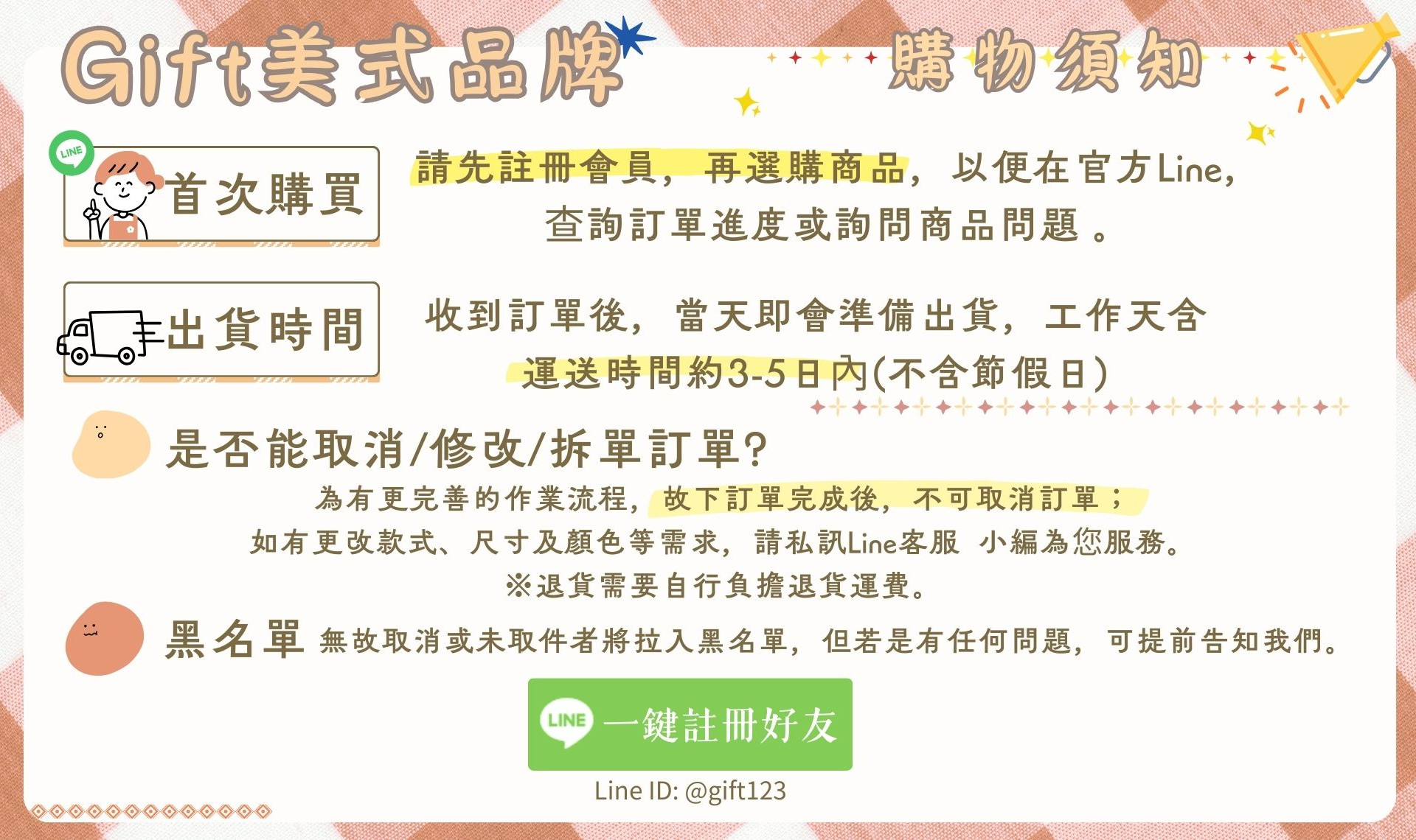 加入Gift美式品牌官方LINE:@gift123 取得最新優惠資訊與好康